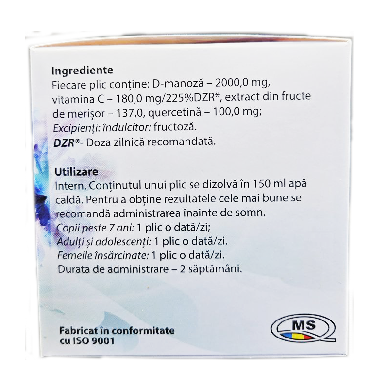 Д-манноза обладает антиадгезивным действием в отношении большинства инфекционных агентов цистита (Escherichia coli, Klebsiella, Proteus, Enterococcus, Streptococcus), блокируя их размножение и улучшая выведение патогенных бактерии с током мочи.